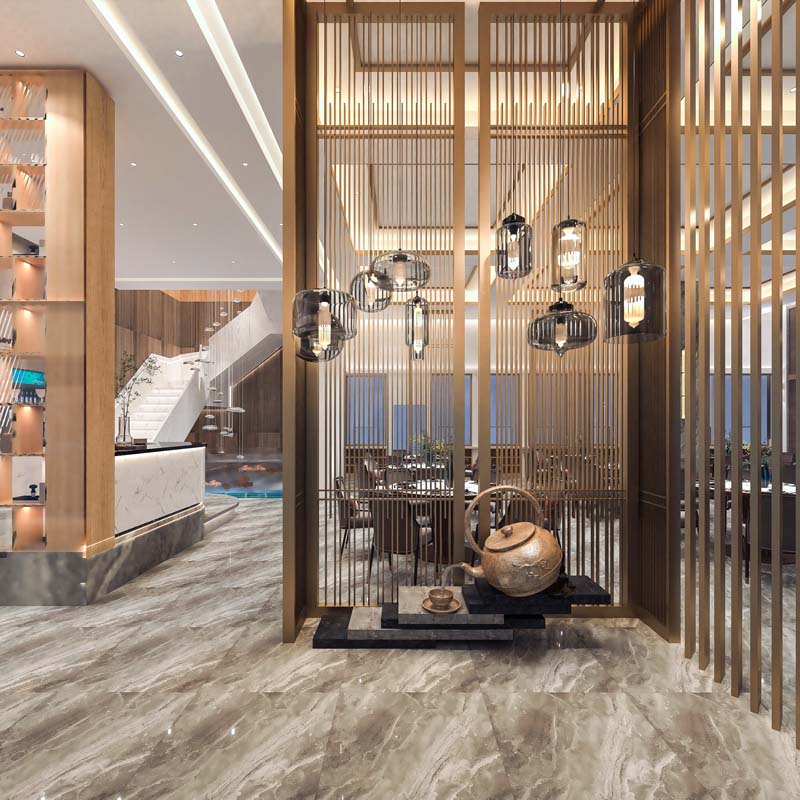 基于現代輕奢感“高檔宴會型餐廳”定位,為滿足消費者的視覺、觸覺等諸多感官體驗,覃工選擇著重使用深淺不一的木色作為基礎色調,搭配淺金色裝飾線條,分布在燈具、吊頂、屏風線條等位置,突出打造“莊重、恢弘”的餐廳氛圍感。