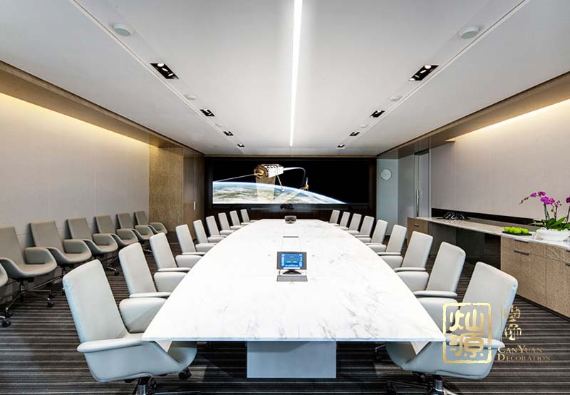 會議室的設計,主要是為了隔音效果,整個南寧現代風格辦公室裝修之會議室采用封閉式設計結構,一則采光充足,二則整個城市的風景盡收眼底。
