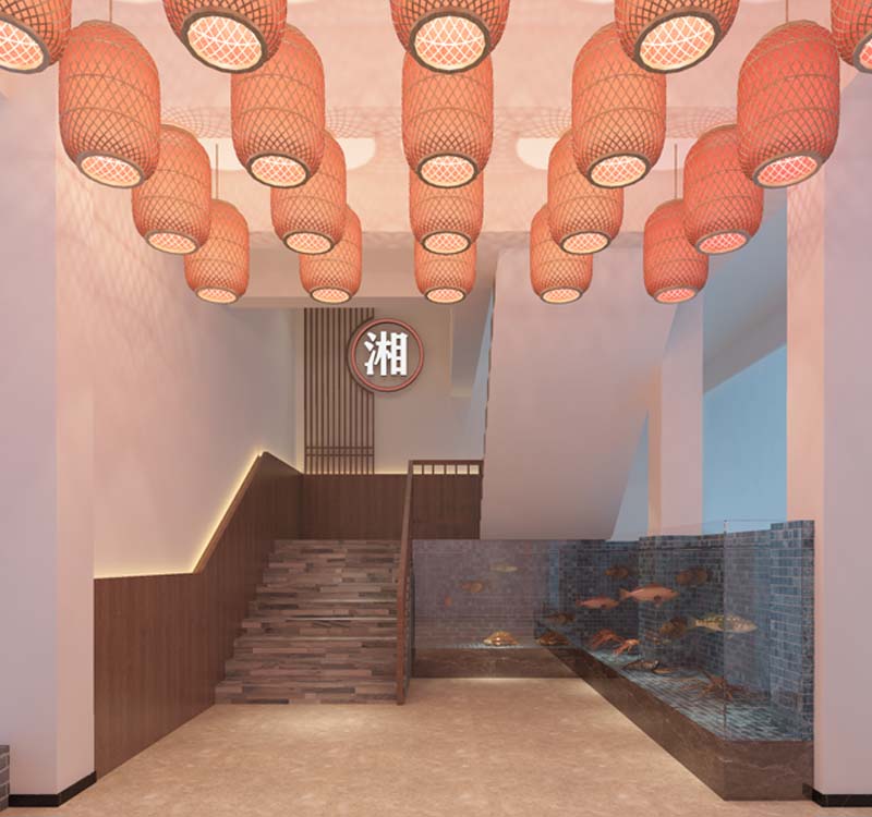 中式仿古設計是這次餐廳設計裝修的主調風格,線條簡潔硬朗的明制桌椅、隔而不斷的木質造型隔斷、鏤空竹編造型燈具、深灰色渲染花色大理石……是“西湘記”的主要構成元素,簡單的白色墻面做打底,搭配點綴的立柱包邊設計及墻面上的大幅裝飾畫,達到既能映襯中式風格的意蘊,又不會喧賓奪主,影響餐廳整體設計效果。