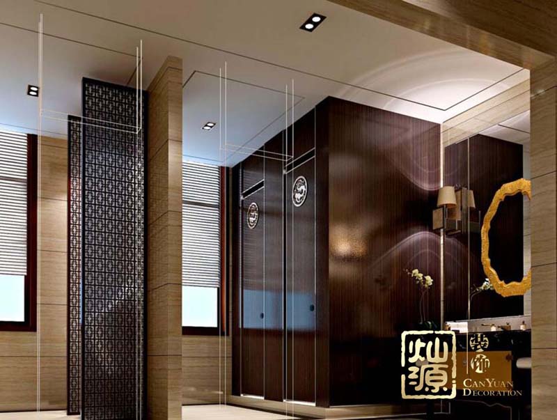 南寧浴足城設計前廳過道:深色實木為主,局部點綴鮮艷濃麗的色調,不著痕跡地顯露出幾分氣息,營造一種沉穩大氣,富麗堂皇的異國情調。