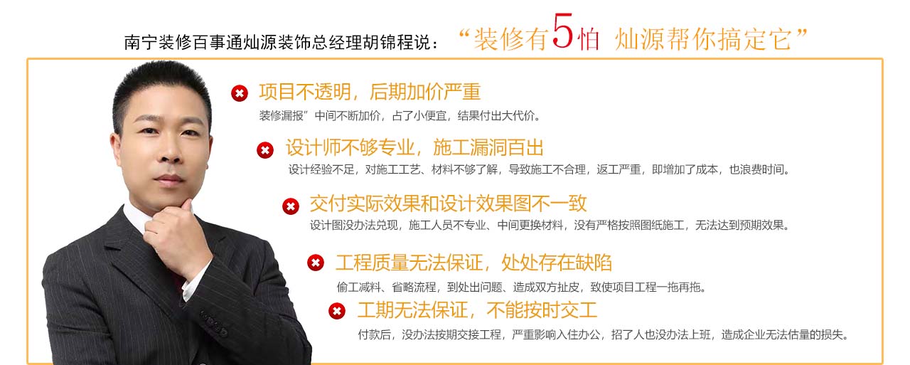 燦源裝飾是一家擁有國家裝飾裝修二級資質和11年室內裝飾工程設計、施工經驗的南寧裝修公司。公司一直致力于打造高品位的辦公室裝修設計、商業空間,為客戶提供方便快捷的一站式服務。公司倡導透明化裝修,擁有O2O工程監控系統,實現工地全天候視頻直播體系,我們敢于將裝修主動權交還到業主手中,讓業主實時掌握工地信息,做質量可靠的放心工程。 燦源裝飾的宗旨...